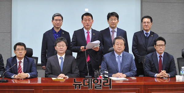 새누리당 김무성 전 대표, 유승민 의원 및 비박계 비주류 의원들이 21일 국회의원회관에서 긴급회동을 갖고 탈당을 선언하고 있다.
