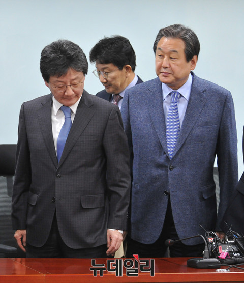 새누리당 김무성 전 대표, 유승민 의원 및 비박계 비주류 의원들이 21일 국회의원회관에서 긴급회동을 갖고 탈당을 선언한 뒤 회의장을 떠나고 있다.