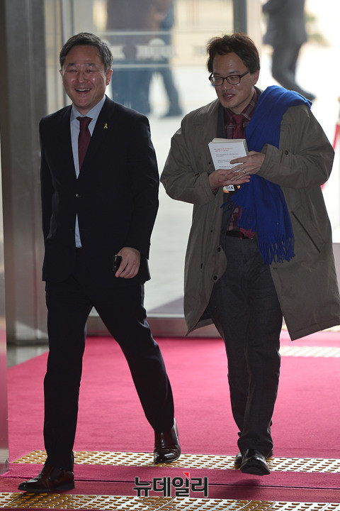 표창원(경기 용인시정), 박주민(서울 은평구갑) 더불어민주당 의원이 21일 오후 국회에서 열린 비경제분야 대정부 질문에 참석하기 위해 국회의사당을 입장하고 있다. 대정부 질문은 이날 오후 2시부터 국회의사당에서 진행되고 있다.