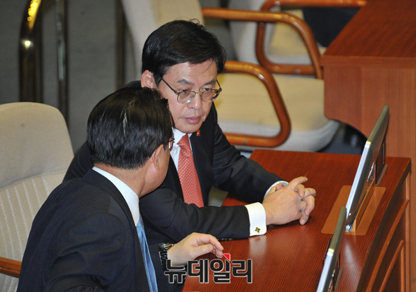 [포토] 대화 나누는 새누리당 정우택 신임 원내대표