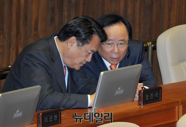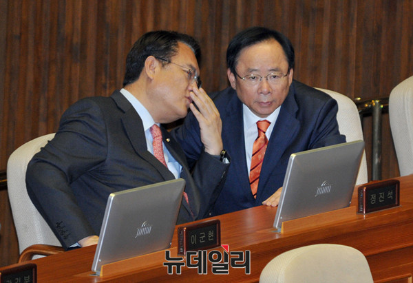 새누리당 원유철 전 원내대표가 21일 오후 국회에서 열린 대정부질문에서 이주영 의원과 대화를 나누고 있다.