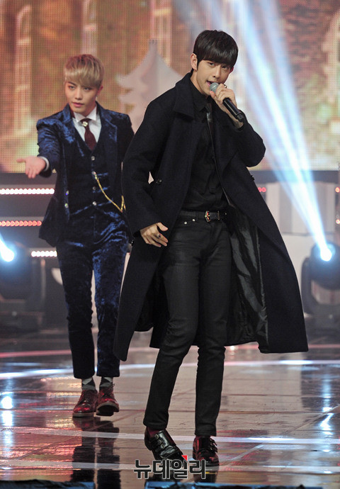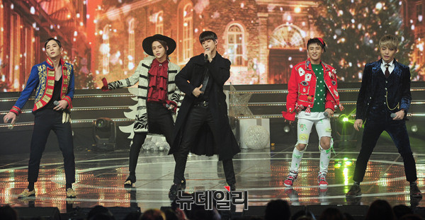 그룹 비트원(BEATWIN : 선혁, 영조, 정하, 윤후, 성호)이 지난 21일 오후 일산 MBC드림센터에서 열린 생방송 '쇼 챔피언(SHOW CHAMPION)'에서 '태양이 뜨면'을 열창하고 있다.