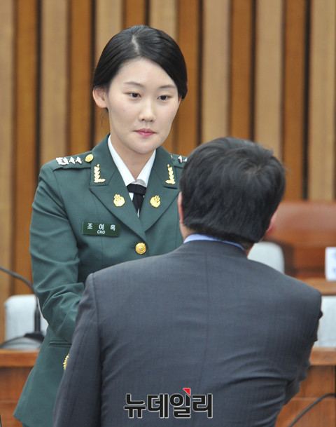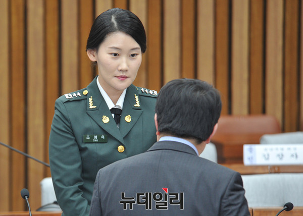 전 대통령경호실 간호장교인 조여옥 대위가 22일 오후 국회에서 열린 '박근혜 정부의 최순실 등 민간인에 의한 국정농단 의혹 사건 진상 규명을 위한 국회 국정조사특별위원회 제5차 청문회' 에서 새누리당 백승주 위원과 인사를 나누고 있다. (사진=공동취재단)