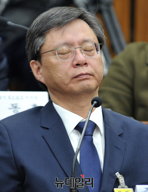 우병우 전 청와대 민정수석비서관이 22일 오후 국회에서 열린 '박근혜 정부의 최순실 등 민간인에 의한 국정농단 의혹 사건 진상 규명을 위한 국회 국정조사특별위원회 제5차 청문회'에서 노승일 K스포츠재단 부장이 "차은택 법적 조력자가 김기동이고 우 수석이 소개시켰다."는 증언이 나오자 고개를 숙이고 있다.