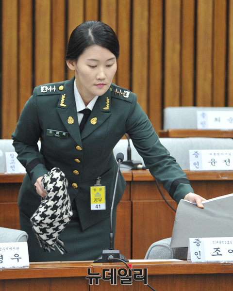 전 대통령경호실 간호장교인 조여옥 대위가 22일 오후 서울 여의도 국회에서 열린 '박근혜 정부의 최순실 등 민간인에 의한 국정농단 의혹 사건 진상 규명을 위한 국회 국정조사특별위원회 제5차 청문회' 오후 질의를 위해 자리에 착석하고 있다. (사진=공동취재단)