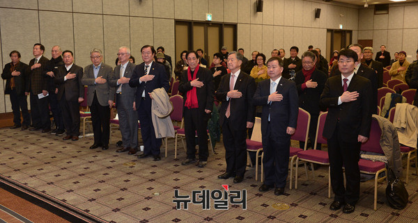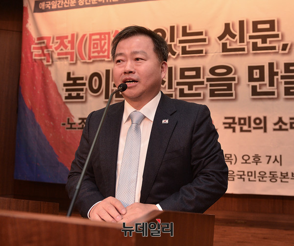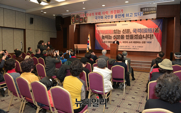 김기수 창간준비위원회 위원장이 22일 오후 서울 중구 은행회관에서 열린 '애국신문(가칭)창간준비위원회 발기인 대회'에서 인사말을 하고 있다.