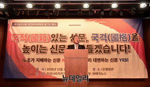 박희도 대한민국지키기불교도총연합 회장이 22일 오후 서울 중구 은행회관에서 열린 '애국신문(가칭)창간준비위원회 발기인 대회'에서 인사말을 하고 있다.