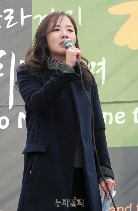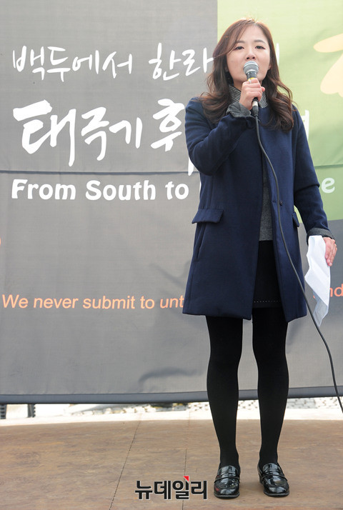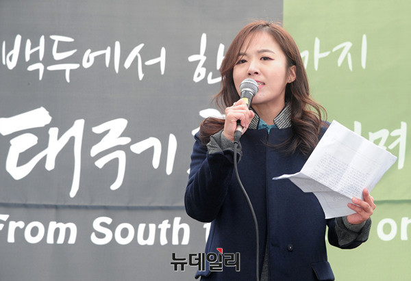 자유경제원 여명 연구원이 24일 오전 서울 청계광장에서 열린 박근혜 대통령 탄핵 무효를 주장하는 '백두에서한라까지, 태극기휘날리며' 집회에 참석해 발언하고 있다.