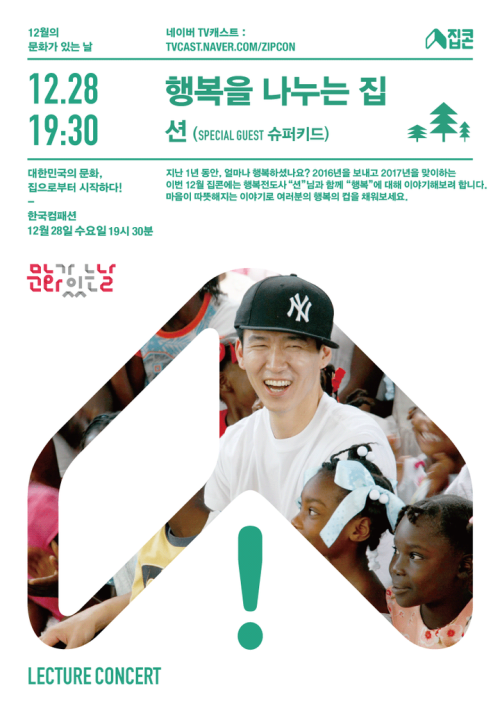 가수 션이 '집콘'의 2016년 마지막 강연자로 나선다.행복전도사로 유명한 션은 12월 집콘에서 '행복을 나누는 집'이란 주제로 오는 28일 컴패션에서 그가 생각하는 행복과 삶의 가치에 대해 진솔하게 이야기 나눌 예정이다.12월 집콘을 앞두고 션은 "행복은 과연 어디서 시작될까요? 2016년 마지막 수요일 여러분과 만나서 행복한 이야기 나누고 싶다"라며 출연 소감을 전했다.이번 집콘에는 스페셜 게스트로 참여한 밴드 슈퍼키드의 라이브 무대도 준비돼 있어 강연과 음악이 어우러진 렉처 콘서트를 선사한다. 슈퍼키드는 션과 정혜영 부부에게 영감을 받아 쓴 곡 '션(Sean)'을 계기로 션과 인연을 맺었다.콘서트를 진행할 공간인 '컴패션'은 전 세계 26개국의 가난으로 고통받는 어린이들을 1:1로 결연해 전인적으로 양육하는 국제어린이양육기구로, 션이 300명의 어린이들을 1:1로 후원하고 있으며, 홍보대사로 후원하고 있는 곳이다.12월 집콘 현장에서는 가족 단위 관객들을 위한 사진 촬영 이벤트를 실시한다.사전 신청자들 중 추첨을 통해 무료로 가족사진을 촬영해 가족들과 기억에 남을 연말 추억을 선물할 계획이다.션과 함께하는 12월 집콘은 네이버 포스트 [집콘]에서 누구나 신청 할 수 있으며, 28일 수요일 오후 7시 30분부터 네이버 TV캐스트를 통해 실시간으로 생중계돼 모바일과 웹을 통해서도 만나볼 수 있다.한편, '집콘(집들이콘서트)'은 집이나 일상 공간 가까이에서 누구나 문화를 즐길 수 있다는 의미를 전파하고자 기획된 캠페인으로, 매달 마지막 수요일 '문화가 있는 날'에 열린다.[사진=CJ E&M]