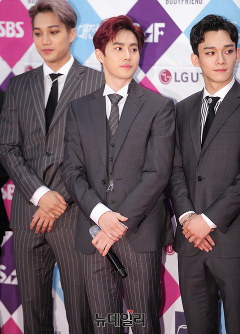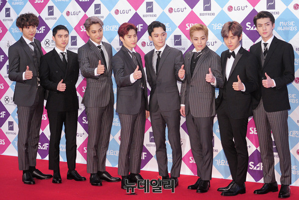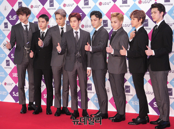 그룹 엑소(EXO : 수호, 찬열, 카이, 디오, 백현, 세훈, 시우민, 레이, 첸, 타오, 루한, 크리스)가 26일 오후 서울 코엑스에서 열린 SBS '2016 SAF(SBS AWARDS FESTIVAL) 가요대전'에 참석해 포토타임을 갖고 있다.