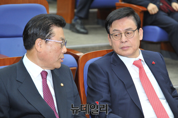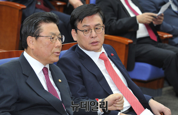 새누리당 정우택 원내대표가 26일 오후 국회에서 열린 새누리당 의원총회에서 박맹우 사무총장과 대화를 나누고 있다.