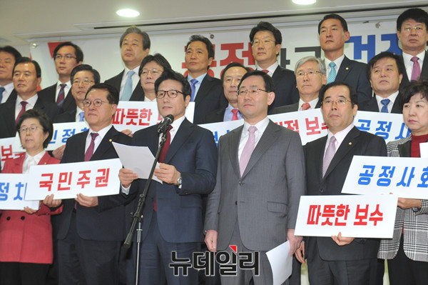 새누리당 비박계의원 29명이 27일 오전 국회 의원회관에서 기자회견을 갖고 새누리당 탈당선언 및 가칭 개혁보수신당 창당 선언을 하고있다.이날 1차 이뤄진 탈당에는 강길부, 권성동, 김무성, 김성태, 김세연, 김영우, 김재경, 김학용, 박성중, 박인숙, 여상규, 오신환, 유승민, 유의동, 이군현, 이은재, 이종구, 이진복, 이학재, 이혜훈, 장제원, 정병국, 정양석, 정운천, 주호영, 하태경 홍문표, 홍일표, 황영철 의원 등 총 29명 의원이 동참했다.