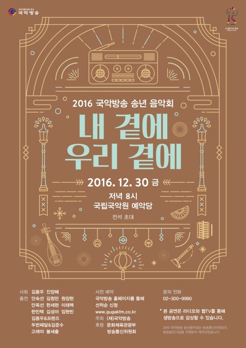 국악방송이 송년음악회를 개최한다.국악방송은 오는 30일 오후 8시 국립국악원 예악당에서 2016 국악방송 송년음악회 '내 곁에 우리 곁에'를 선보인다. MC는 소리꾼 김용우와 국악방송 '책이 좋은 밤'의 진행자 진양혜가 맡는다.이번 공연은 올해 15주년을 맞은 국악방송이 애청자와 함께 지난 한 해를 돌아보고 희망의 새해를 맞이하기 위해 마련한 자리다.한국을 대표하는 안숙선 명창을 비롯해 민속악 대가들이 연주하는 즉흥음악 구음 시나위, 월드뮤직 밴드, 두번째달, 소리꾼 김준수 등 올 한해 주목받은 젊은 예술가와 명인이 출연해 풍성한 무대를 꾸민다.또, 2016년 10회 대회를 맞이한 21C한국음악프로젝트의 주역 불세출과 코리안포크뮤직밴드 고래야가 참여한다. 여기에 데뷔 20주년에 빛나는 소리꾼 김용우가 재즈뮤지션들과 함께 담아낸 우리민요를 들려준다.2016 국악방송 송년음악회 '내 곁에 우리 곁에'는 전석 무료 초대로 진행되며, 국악방송 라디오와 웹TV를 통해 생방송으로 만날 수 있다.[사진=국악방송]
