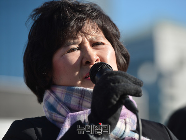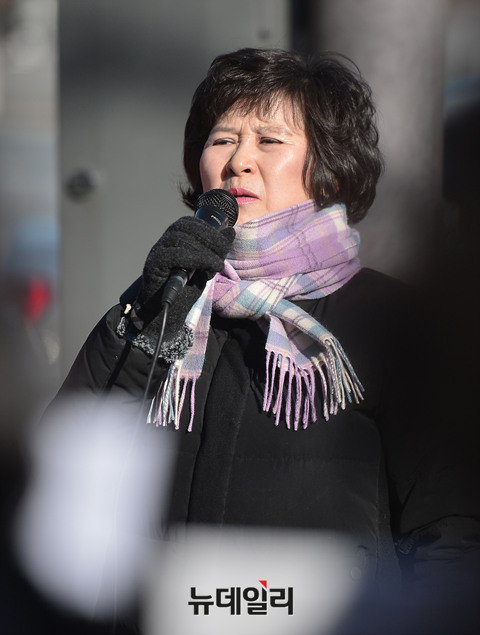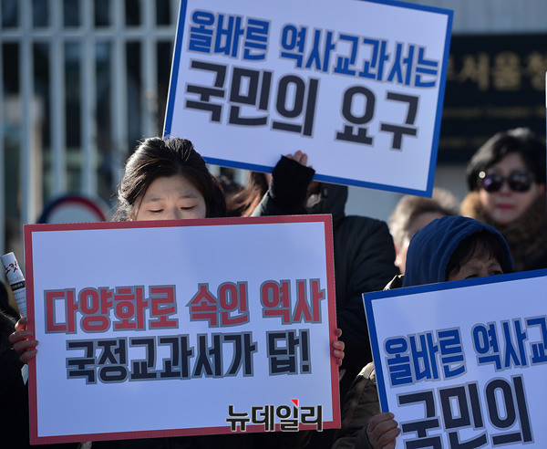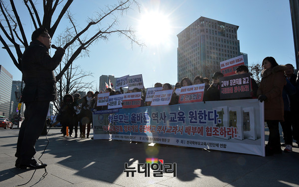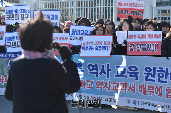 이경자 전국학부모교육시민단체연합 대표가 27일 오후 서울정부종합청사 정문 앞에서 기자회견을 열고 "국정 역사교과서 현장 적용을 못한 이준식 교육부장관과 교육부 관계자들은 총 사퇴하라"고 주장했다. 앞서 이날 오전 교육부는 "국정 역사교과서에 대한 현장 적용을 1년 늦추겠다"고 발표했다.