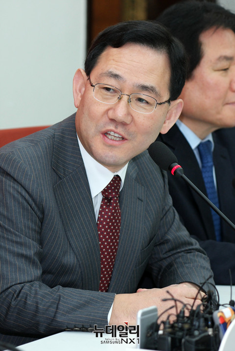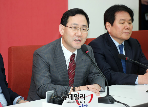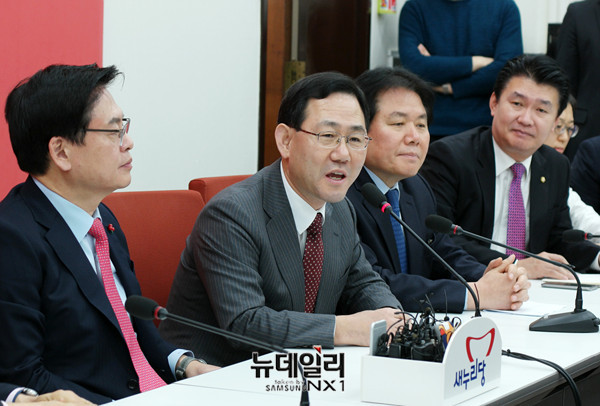 개혁보수신당(가칭) 주호영 신임 원내대표가 28일 오전 국회 새누리당 원내대표실에서 정우택 새누리당 원내대표를 예방해 발언하고 있다.