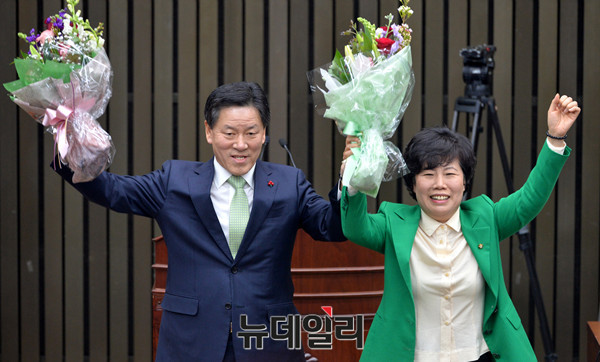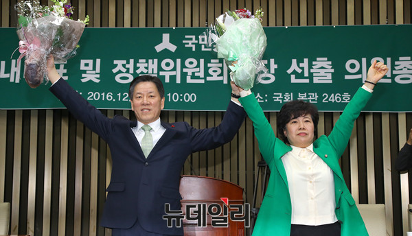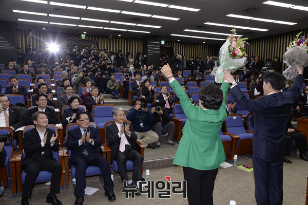 국민의당 신임 원내대표 선출을 위한 의원총회가 29일 오전 국회에서 열린 가운데 각 신임 원내대표와 정책위의장으로 선출된 주승용, 조배숙 의원이 손을 들어 인사하고 있다. (사진=공동취재단)