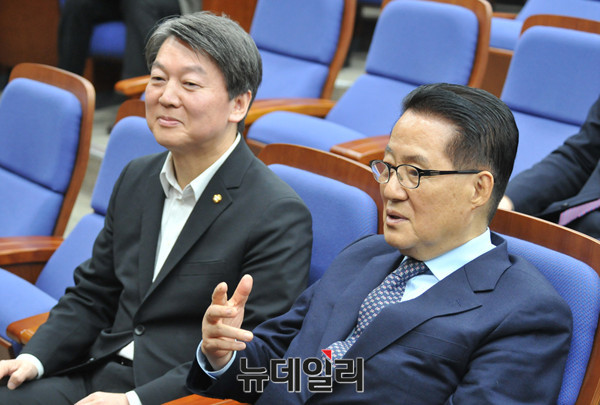 국민의당 박지원 원내대표와 안철수 의원이 29일 오전 국회에서 열린 국민의당 의원총회에서 대화를 나누고 있다.