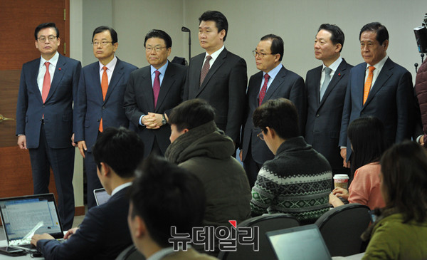 새누리당 정우택 원내대표 및 지도부가 30일 오전 서울 여의도 당사 기자실에서 열린 인명진 비상태책위원장의 기자회견을 지켜보고 있다.