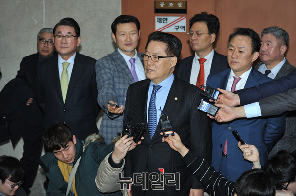 박지원 국민의당 전 원내대표가 2일 오전 국회 정론관에서 열린 당대표 출마 선언 기자회견을 마친 후 기자들의 질문에 답하고 있다.