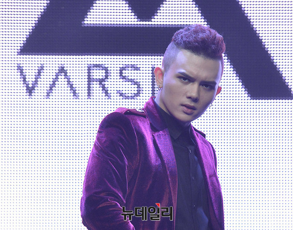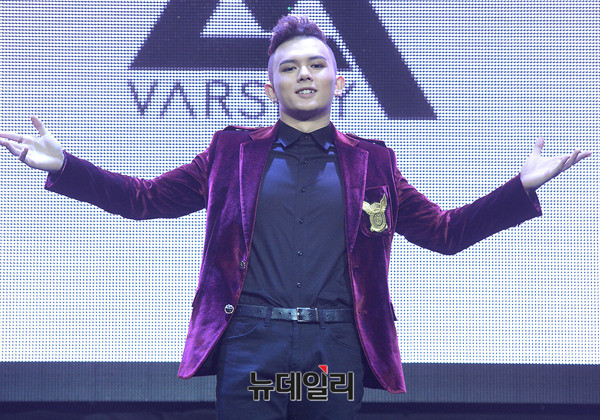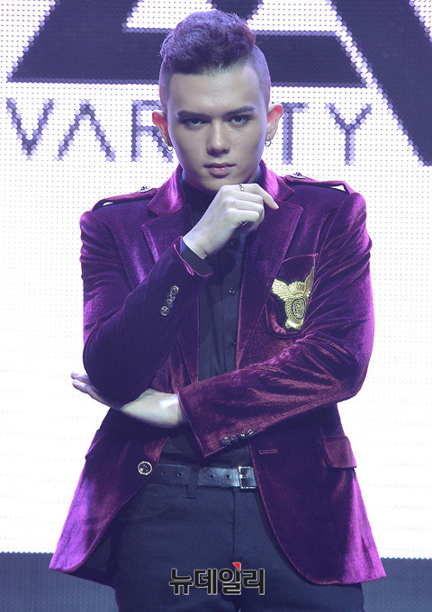 글로벌 아이돌 그룹 '바시티(VARSITY)' 멤버 만니가 2일 오후 서울 마포구 예스24무브홀에서 열린 데뷔 쇼케이스에서 포토타임을 갖고 있다.