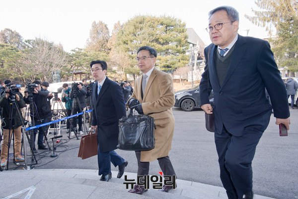 박근혜 대통령 탄핵심판 첫 변론기일인 3일 오후 대통령 변호인단인 채명선, 이중환 변호사(왼쪽부터)가 서울 종로구 헌번재판소로 입장하고 있다.
