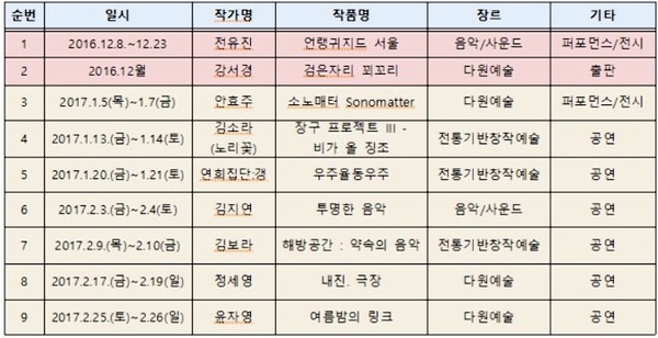 작품별 일정은 날짜순으로 ▲안효주 '소노매터'(퍼포먼스/전시, 1/5~7일) ▲김소라(노리꽃) '장구 프로젝트 III - 비가 올 징조'(공연, 1/13~14) ▲연희집단:갱 '우주율동우주'(공연, 1/20~21일) ▲김지연 '투명한 음악'(공연, 2/3~4일) ▲김보라 '해방공간: 약속의 음악'(공연, 2/9~10일) ▲정세영 '내진, 극장'(공연, 2/17~19일) ▲윤자영 '여름밤의 링크'(공연, 2/25~26일) 등이다.