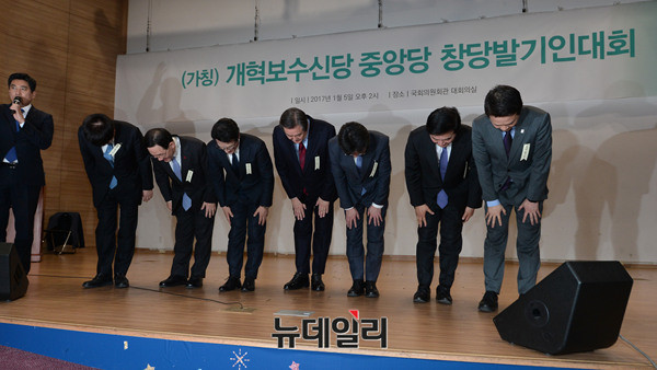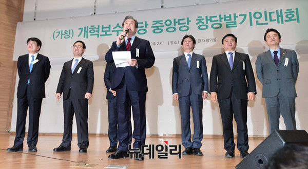 이종구, 주호영, 정병국, 김무성, 유승민 의원, 원희룡 제주지사, 남경필 경기지사가 5일 오후 국회의원회관 대회의실에서 열린 개혁보수신당(가칭) 중앙당 창당발기인대회에 참석해 포토타임을 갖고 있다. 개혁보수신당은 "깨끗한보수, 따뜻한보수"를 슬로건으로 내걸었다. 창당준비위원장은 5선의 정병국 의원이 추대됐다.