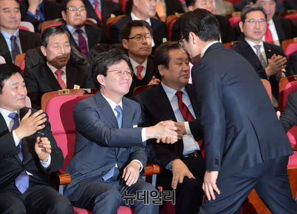 정병국 창당준비위원장과 유승민 의원이 5일 오후 국회의원회관 대회의실에서 열린 개혁보수신당(가칭) 중앙당 창당발기인대회에 참석해 악수하고 있다. 개혁보수신당은 "깨끗한보수, 따뜻한보수"를 슬로건으로 내걸었다. 창당준비위원장은 5선의 정병국 의원이 추대됐다.