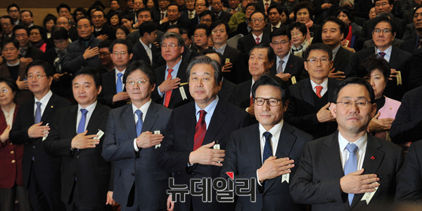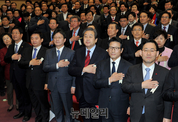 개혁보수신당(가칭) 중앙당 창당발기인대회가 5일 오후 국회의원회관 대회의실에서 열린 가운데 참석자들이 국민의례를 하고 있다.