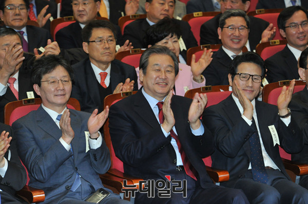 개혁보수신당(가칭) 중앙당 창당발기인대회가 5일 오후 국회의원회관 대회의실에서 열린 가운데 (왼쪽부터) 유승민, 김무성 정병국 의원이 참석해 박수를 치고 있다.