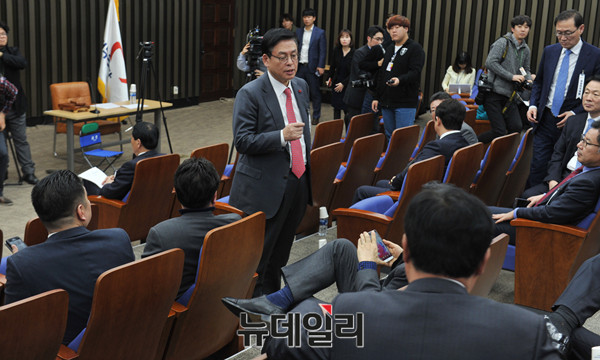 새누리당 비대위원 구성 등의 안건으로 6일 오후 국회에서 열릴 예정이었던 상임전국위원회가 정족수 미달로 지연되고 있는 가운데 정우택 원내대표가 지연 이유를 설명하고 있다.