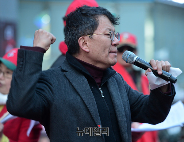 박성현 뉴데일리 주필이 7일 오후 서울 강남구 선릉역 인근에서 열린 대통령탄핵기각을위한국민총궐기운동본부(탄기국) 8차 태극기 집회에 참석해 발언하고 있다.