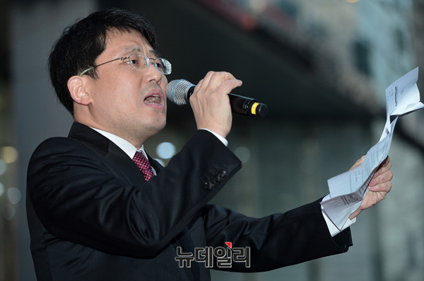 자유와통일을위한변호사연대 도태우 변호사가 7일 오후 서울 강남구 선릉역 인근에서 열린 대통령탄핵기각을위한국민총궐기운동본부(탄기국) 8차 태극기 집회에 참석해 발언하고 있다.