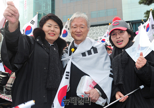 박근혜 대통령 법률대리인을 맡은 서석구 변호사가 지난 7일 오후 서울 강남구 삼성동 코엑스 앞에서 열린 '박근혜대통령 탄핵반대 태극기 집회'에 참석했다. 이날 서 변호사는 태극기를 두르고 집회 참가자들과 함께 '탄핵반대'를 외쳤다.
