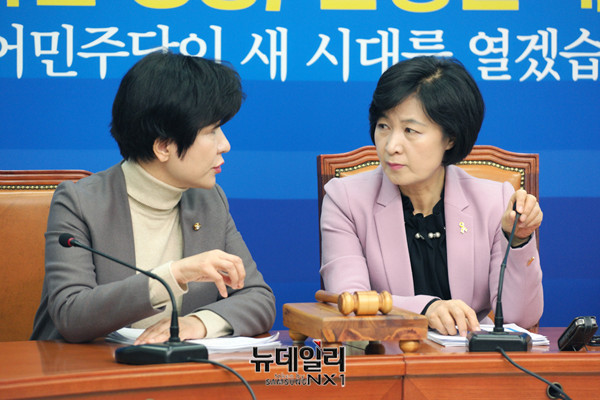 더불어민주당 추미애 대표와 김영주 최고위원이 9일 오전 국회 더불어민주당 당대표실에서 열린 최고위회의에서 대화를 나누고 있다.