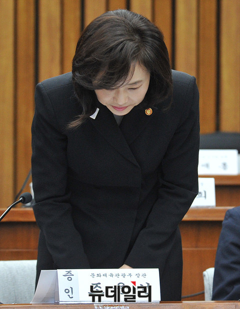 조윤선 문화체육관광부 장관이 9일 오후 국회에서 열린 '박근혜 정부의 최순실 등 민간인에 의한 국정농단 의혹사건 진상규명 위한 국정조사특별위원회의 7차 청문회'에 증인으로 출석해 고개를 숙여 국민들에게 사과하고 있다.