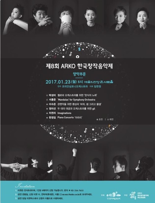 '제8회 ARKO 한국창작음악제'(이하 아창제) 양악부문 연주회가 오는 23일 예술의전당 콘서트홀에서 열린다.2007년부터 시작된 'ARKO 한국창작음악제'는 우리나라 창작음악의 발전을 위해 한국문화예술위원회와 한국창작음악제추진위원회가 추진하며, 국악과 양악 부문으로 나뉘어 진행한다.황병기 아창제 추진위원장은 "아창제는 우수 관현악 작품을 발굴하고 기획연주회를 개최함으로써 창작 활성화와 저변 확대의 기반을 마련해 이 시대 우리 음악을 발견하고자 한다"며 "창작관현악곡에 관심 있는 관객들을 누구나 환영한다"고 밝혔다.'제8회 아창제'는 국내 클래식 음악계의 대표 작곡가와 지휘자들로 심의위원회를 구성해 곡의 예술성 뿐만 아니라 공연 가능성과 지원 후 기대효과를 다각도로 검토 후 작품을 선정했다.이번 양악부문 연주회는 공모를 통해 선정된 6인 작곡가의 작품이 임헌정 지휘자가 이끄는 코리안심포니오케스트라의 연주로 첫 선을 보인다. 6명의 작곡가는 30~60대로 순수 국내파부터 해외 유학파까지 이력 또한 각양각색이다.앞서 국악부문 연주회는 지난해 11월 15일 예술의전당 콘서트홀 객석을 가득채운 청중들의 환호 속에 성황리에 막을 내렸다.아창제 양악부문 연주회는 사전 예약시 무료 관람이 가능하며, 아창제 사무국을 통해 예약하면 공연당일 티켓박스에서 티켓을 수령할 수 있다.[사진=한국문화예술위원회]