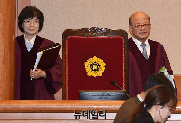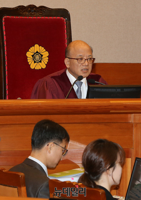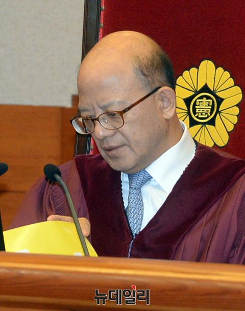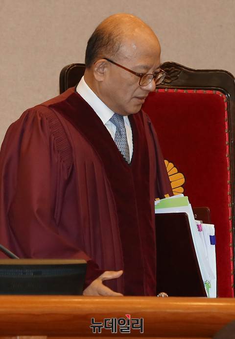 박한철 헌법재판소 소장이 10일 오전 서울 종로구 헌법재판소 대심판정에서 열린 '박근혜대통령 탄핵심판사건 3차변론'에 입장하고 있다. (사진=공동취재단)