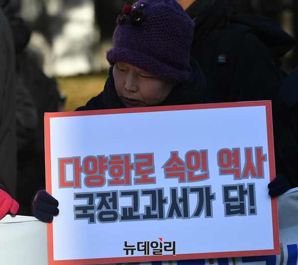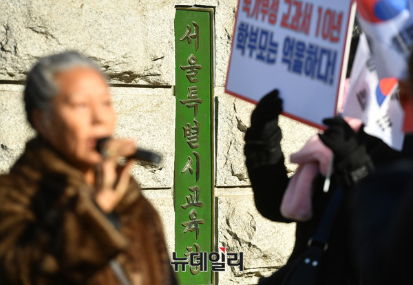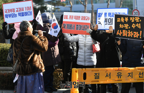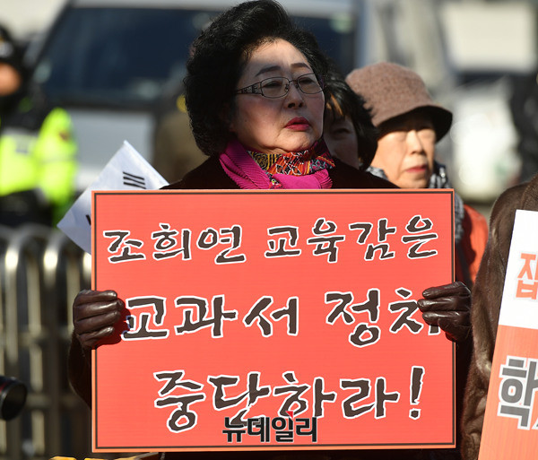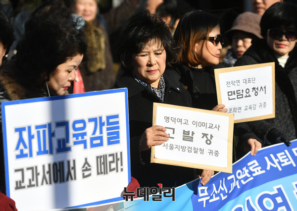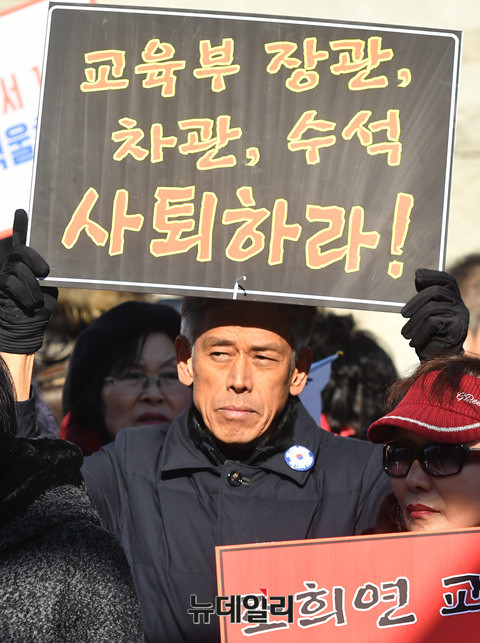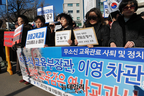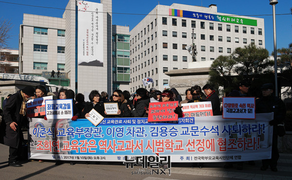전국학부모교육시민단체연합(전학연)이 10일 오후 서울시 중구 서울시교육청 정문 앞에서 기자회견을 열고 "역사국정화교과서 방침을 철회한 이준식 교육부장관, 이영 차관, 김용승 교육문화수석비서관은 사퇴하고, 조희연 교육감은 역사교과서 시범학교 선정에 협조하라"고 주장했다.