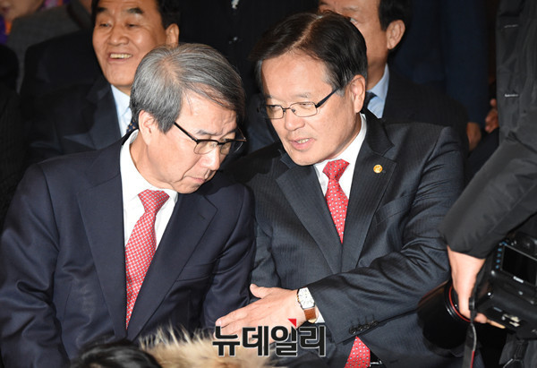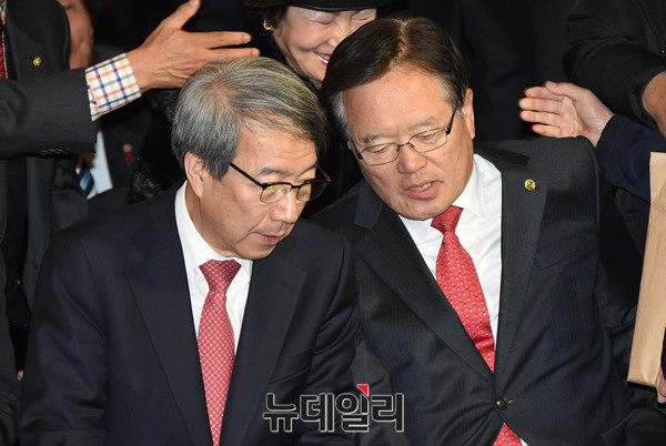 늘푸른한국당 창당대회가 11일 오후 서울 세종문화회관에서 열린 가운데 정운찬 전 국무총리 정의화 전 국회의장이 대화를 나누고 있다.