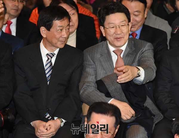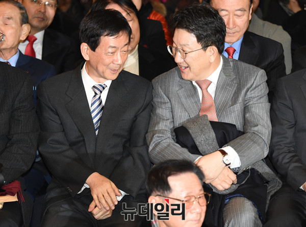 늘푸른한국당 창당대회가 11일 오후 서울 세종문화회관에서 열린 가운데 진영 더불어민주당 의원과 권성동 바른정당 의원이 참석해 대화를 나누고 있다.
