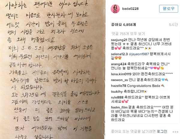 "그동안 S.E.S.의 재결합을 위해 조금은 미뤄뒀던 이야기를 공유하려 한다"고 구체적인 결혼 계획을 밝힌 바다는 "어느덧 시간이 많이 흘러 두 요정(유진·슈)은 먼저 시집을 가고 저 혼자 미스로 남았었다"며 "(결혼 이후에도)계속 깊고 넓어지는 바다를 응원하고 기대해달라"고 당부했다.