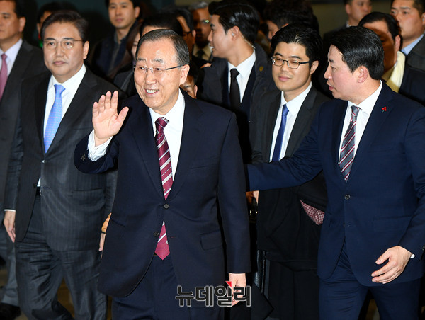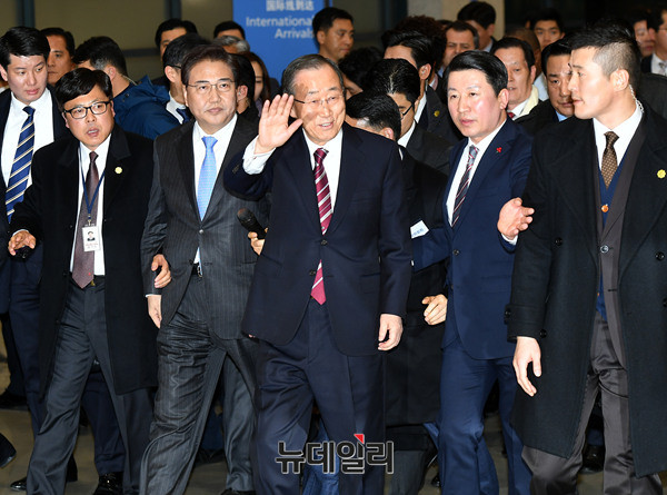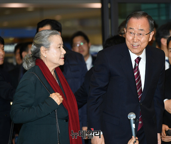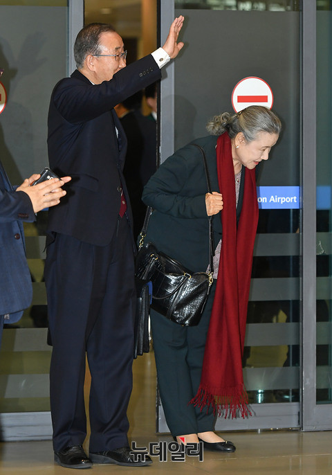 반기문 전 유엔사무총장이 부인 유순택 여사와 함께 12일 오후 인천국제공항을 통해 입국했다. 반 전 사무총장은 11일(현지시간) 오후 1시 미국 뉴욕 JFK 공항을 출발해 인천공항에 오후 5시 30분께 도착했다.