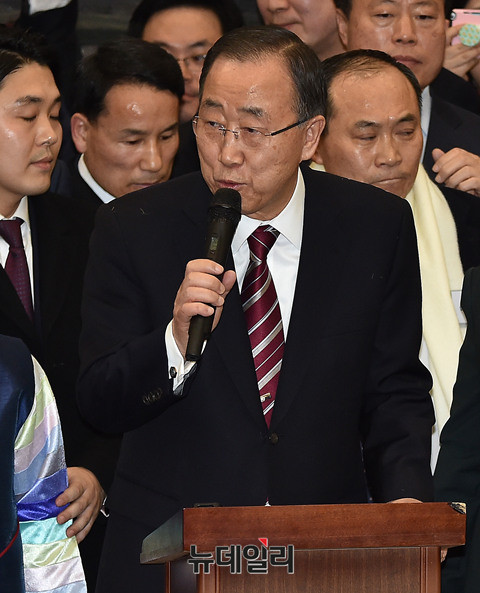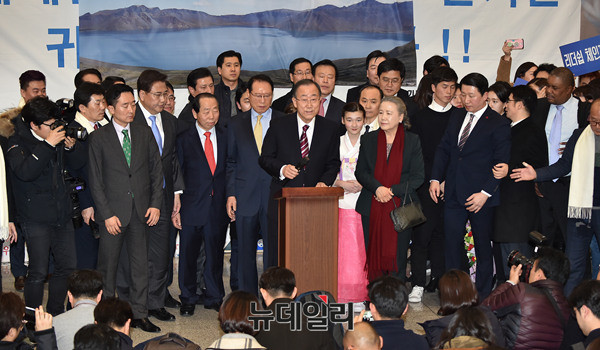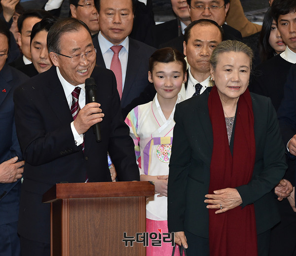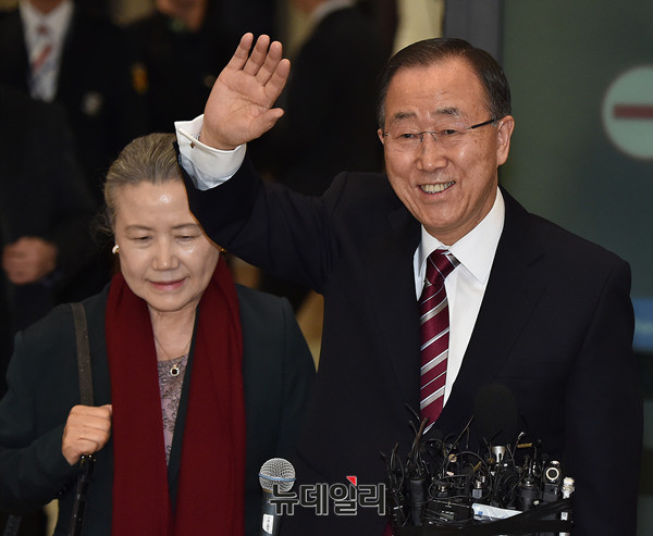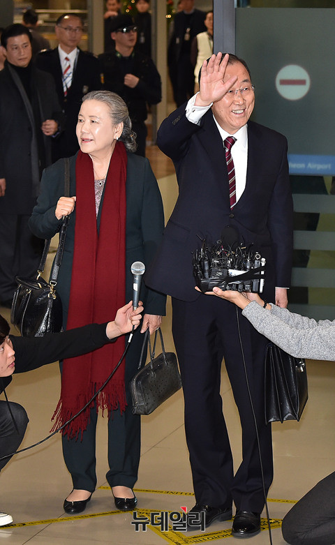 반기문 전 유엔사무총장이 부인 유순택 여사와 함께 12일 오후 인천국제공항을 통해 입국해 귀국 인사말을 하며 고개를 숙이고 있다. 반 전 사무총장은 11일(현지시간) 오후 1시 미국 뉴욕 JFK 공항을 출발해 인천공항에 오후 5시 30분께 도착했다.