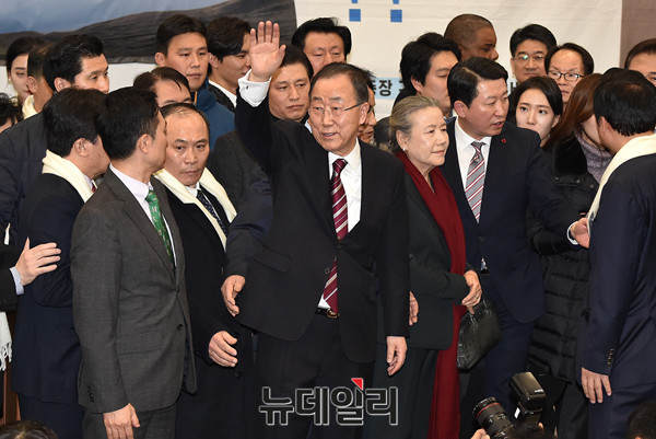 반기문 전 UN사무총장과 부인 유순택 여사가 12일 오후 인천국제공항으로 귀국해 환영 인파에 손을 흔들어 인사하고 있다.