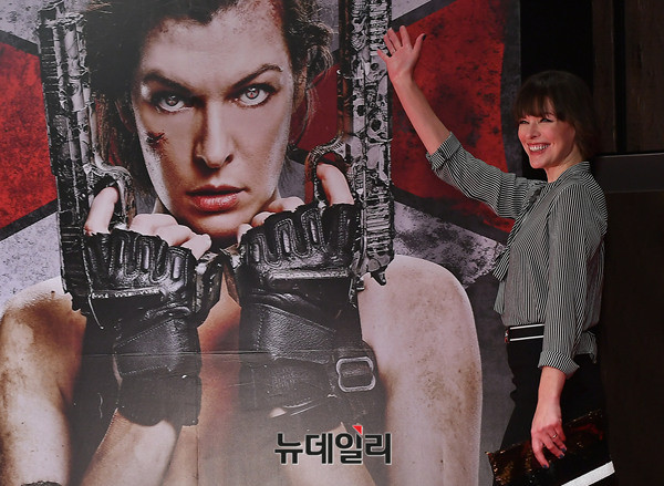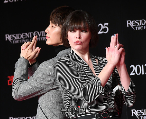 헐리우드 배우 밀라요보비치가 13일 오전 서울 종로구 포시즌호텔서울에서 열린 영화 '레지던트이블-파멸의날' 기자간담회에 앞서 이준기와 포토타임을 갖고 있다. 밀라요보비치는 극 중에서 인류유일한 희망이자 전사 '앨리스' 역을 맡았다. 오는 25일 개봉 예정이다.
