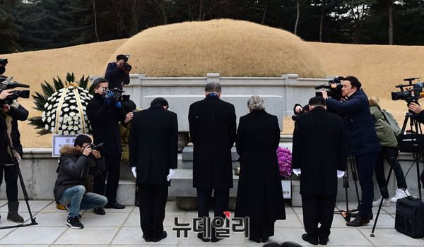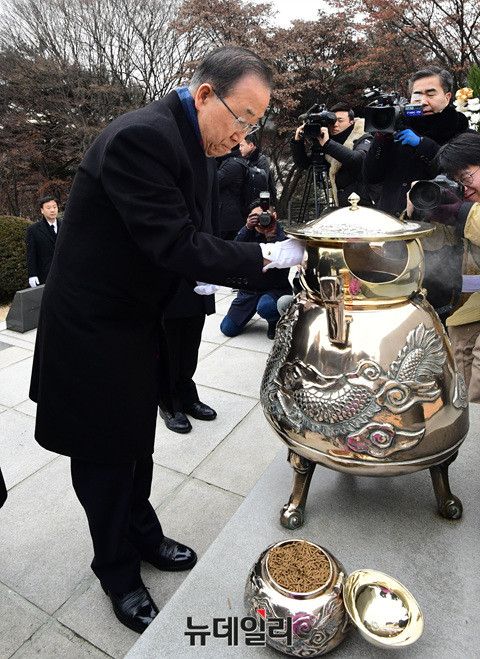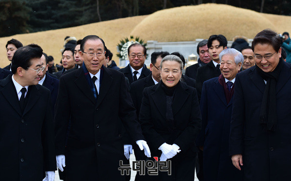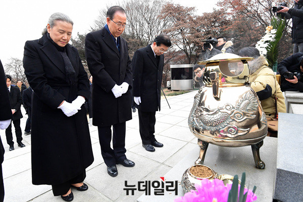 반기문 전 유엔사무총장이 13일 오전 서울 국립현충원을 방문해 이승만 전 대통령 묘역을 참배하고 있다. 이날 참배는 반 전 사무총장이 입국 후 가진 첫 공식 일정이다. 반 전 사무총장은 지난 12일 오후 인천국제공항을 통해 입국했다.(사진=공동취재단)