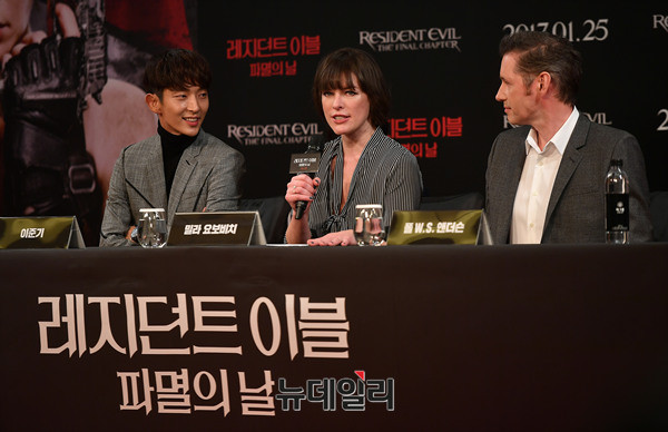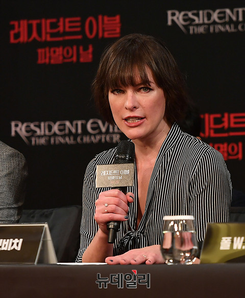 헐리우드 배우 '밀라 요보비치'가 13일 오전 서울 종로구 포시즌호텔서울에서 열린 영화 '레지던트이블-파멸의날' 기자간담회에서 물을 마시고 있다. 이날 기자간담회에는 연출을 맡은 '폴 앤더슨' 감독과 배우 '밀라 요보비치', 특별출연한 이준기가 참석했다. 오는 25일 개봉 예정.