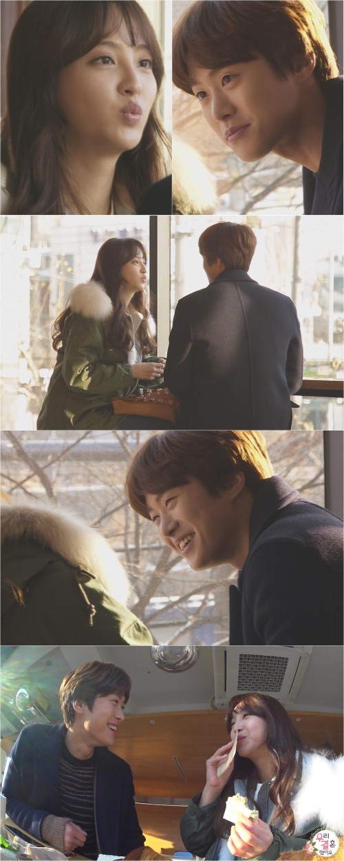 '우결' 정혜성이 공명 앞에서 입술을 쭉 내밀고 뽀뽀 자세를 취한 모습이 포착됐다.14일 방송될 MBC '우리 결혼했어요'(이하 '우결')에서는 카페 데이트에 나선 공명-정혜성의 모습이 전파를 탄다.이날 공명은 신혼집 구하기에 앞서 정혜성에게 보여줄 신혼집 후보들을 사진으로 미리 준비하는 등 듬직한 남편의 면모를 보여줬다. 두 사람은 함께 사진을 보며 들뜬 마음을 감추지 못했고, '꽁냥꽁냥' 신혼부부의 모습을 과시했다.그런 가운데, 공명에게로 직진하는 정혜성의 뽀뽀 사진이 눈길을 끈다. 정혜성은 입술을 모아 쭉 내밀고 있는 것. 이에 공명은 정혜성에게 홀린 듯 눈이 커진 채 앞으로 다가와 다음 장면을 더욱 궁금하게 만들고 있다.제작진에 따르면 두 사람은 시작부터 달달한 분위기를 형성시켰다는 전언. 공명은 정혜성을 빤히 바라보며 "오늘 귀욤귀욤하네~ 더 예뻐졌네~"라고 칭찬을 아끼지 않았다. 정혜성 역시 "부끄러운데 좋구만~"이라며 얼굴이 붉어졌다.또, 공명은 정혜성의 무릎에 손을 얹었고, 정혜성이 그 위에 다시 손을 포개며 자연스러운 스킨십을 만들어내는 등 한 단계 더 가까워진 모습을 보여준 것으로 알려졌다.정혜성의 입술 뽀뽀 유혹 현장은 14일 오후 4시 55분 '우리 결혼했어요'를 통해 공개된다.['우리결혼했어요' 공명 정혜성, 사진=MBC]