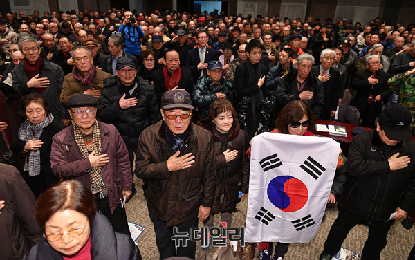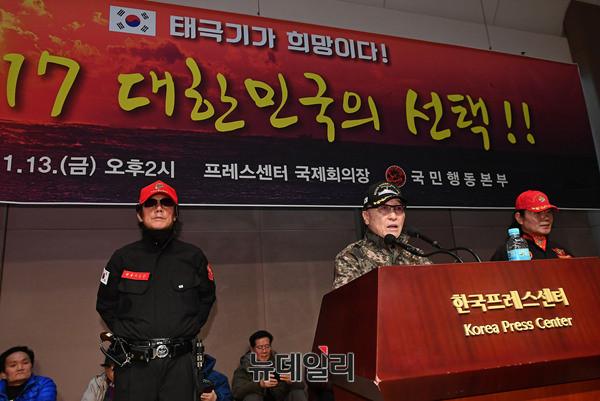 서정갑 국민행동본부장이 13일 오후 한국프레스센터에서 열린 '2017대한민국의선택 : 대한민국이냐 공산화냐?' 강연회 앞서 인사말을 하고 있다. 국민행동본부가 주최한 이날 강연회는 조갑제 조갑제닷컴대표, 허평환 전 기무사령관이 강연자로 나섰다.